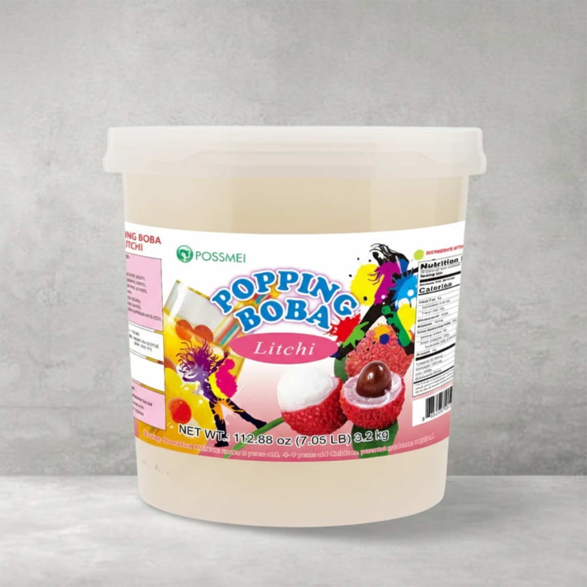 Esferas de gelatina rellenas con jugo saborizado de litchi. Ideales para bebidas frías, bubble tea, frappés y postres.